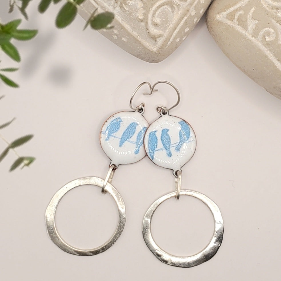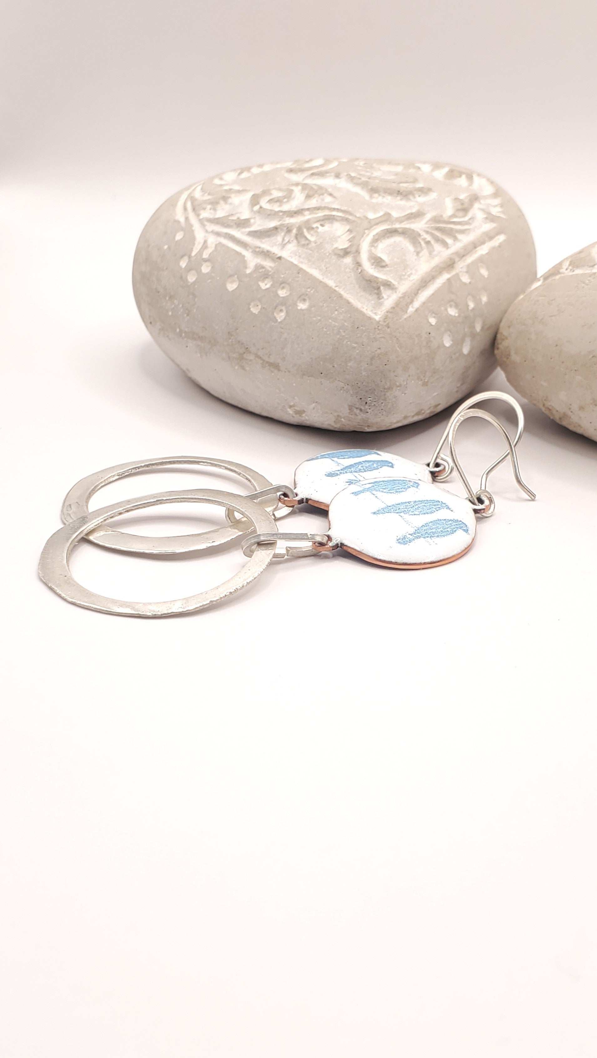 Ces boucles d'oreilles révèlent de délicats oiseaux bleus posés sur leur perchoir. Créés en émail grand feu sur fond blanc, chaque médaillon émaillé est prolongé par un élégant anneau aplati en argent fin, créant un mouvement gracieux et aérien.