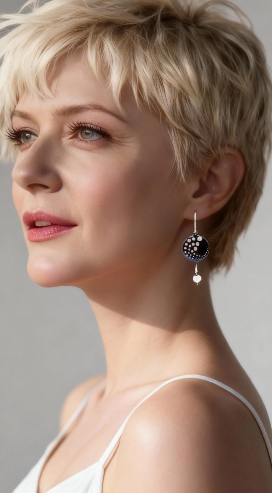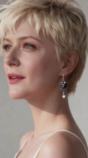 Inspirées par le design contemporain et l'esprit festif, ces boucles d'oreilles jouent sur le contraste entre le noir profond et les reflets argentés. Les pois en lustre d'argent évoquent des confettis ou des bulles de champagne, tandis que la perle argent satinée ajoute une note précieuse et moderne. Un bijou qui ne passe pas inaperçu.