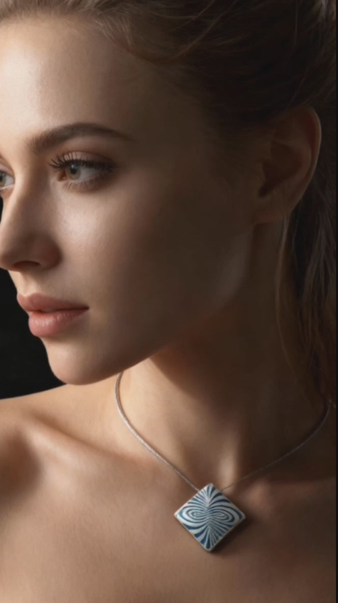Pendentif artisanal carré en émail sur argent fin, une création unique qui capture l'essence de l'infini dans un motif hypnotique.
