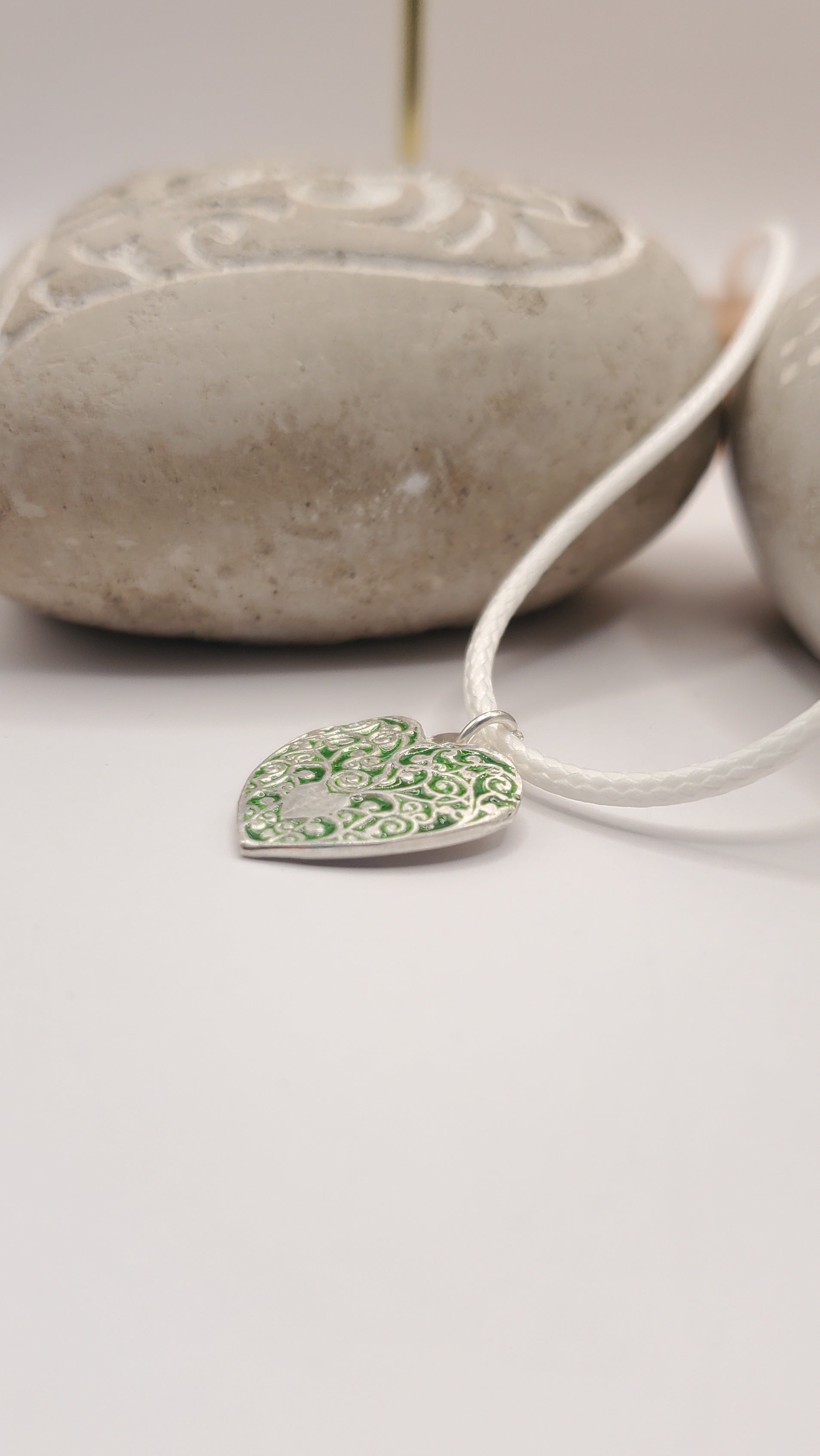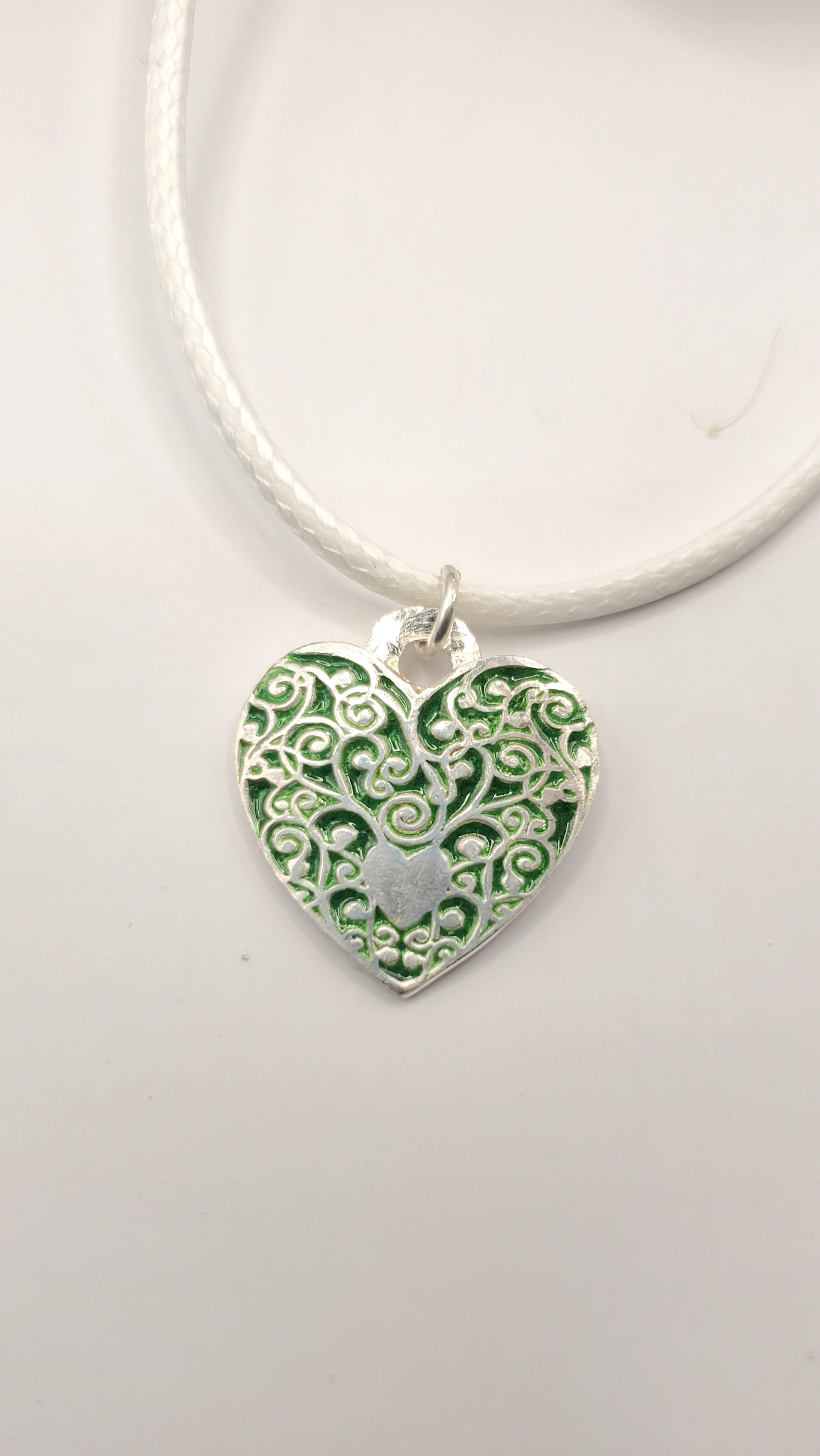 Ce pendentif révèle un émail vert aux nuances subtiles, créé selon la technique ancestrale de l'émail grand feu champlevé. De délicates arabesques en argent viennent orner le cœur, créant un motif ajouré d'une grande finesse que l'émail viendra combler.