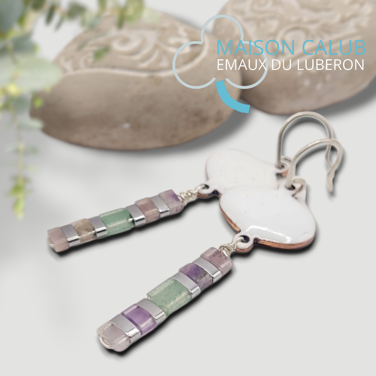 Boucles d'oreilles en émail opaque blanc pur, sur cuivre, et agrémentées de perles miyuki en pierre naturelles: aventurine, améthyste et hématite.